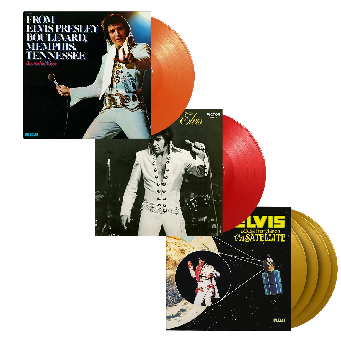 A new bundle of 3 exclusive Elvis Presley albums!Includes:• From Elvis Presley Blvd Memphis, TN (Orange)• That's The Way It Is (Red)• Aloha From Hawaii VIa...