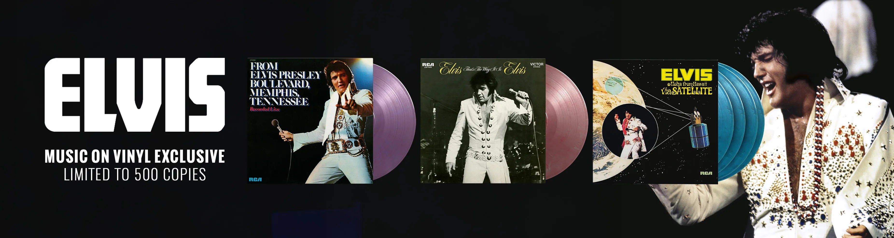 A new bundle of 3 exclusive Elvis Presley albums!Includes:• From Elvis Presley Blvd Memphis, TN (Purple Marble)• That's The Way It Is (Red/Silver Marble)• Aloha From...