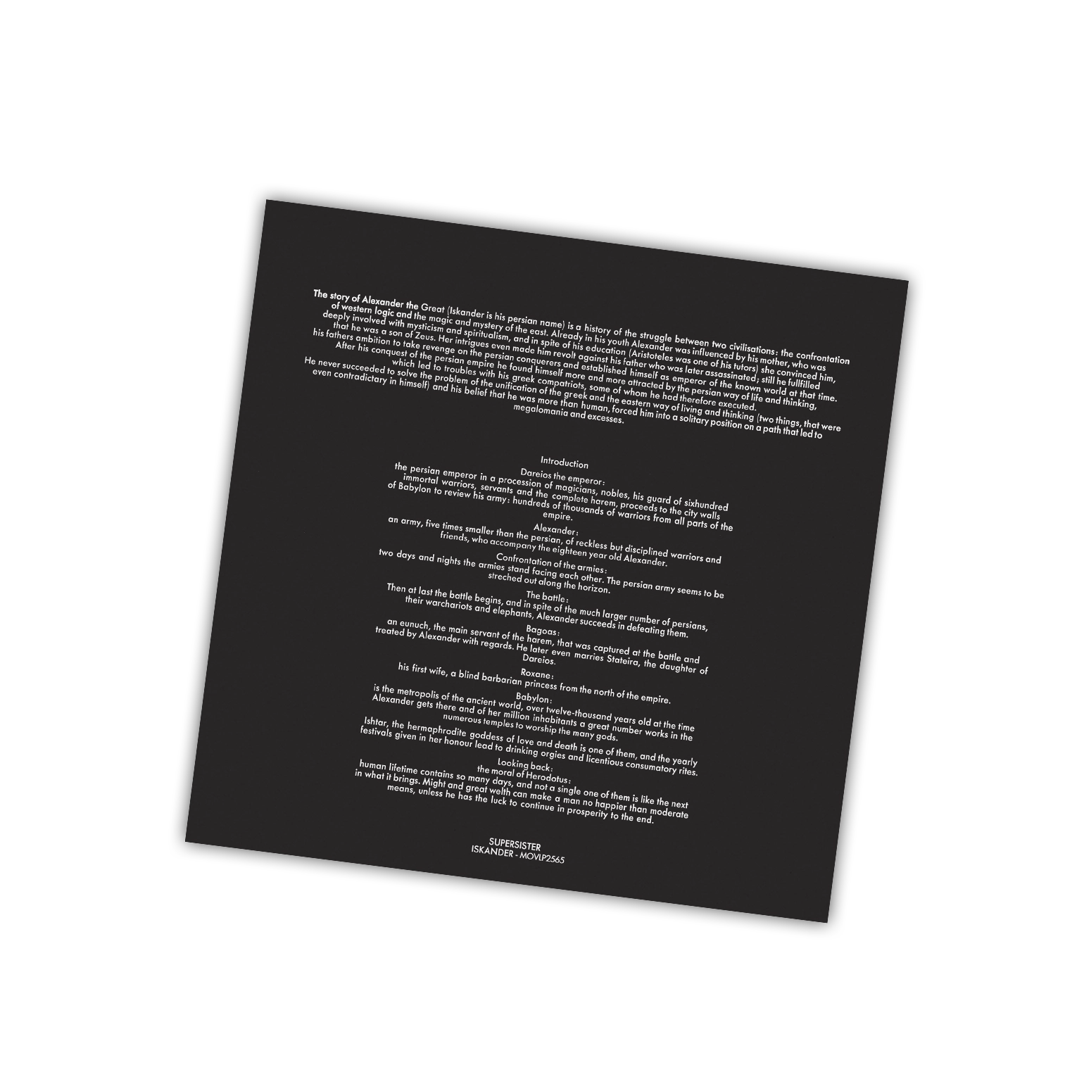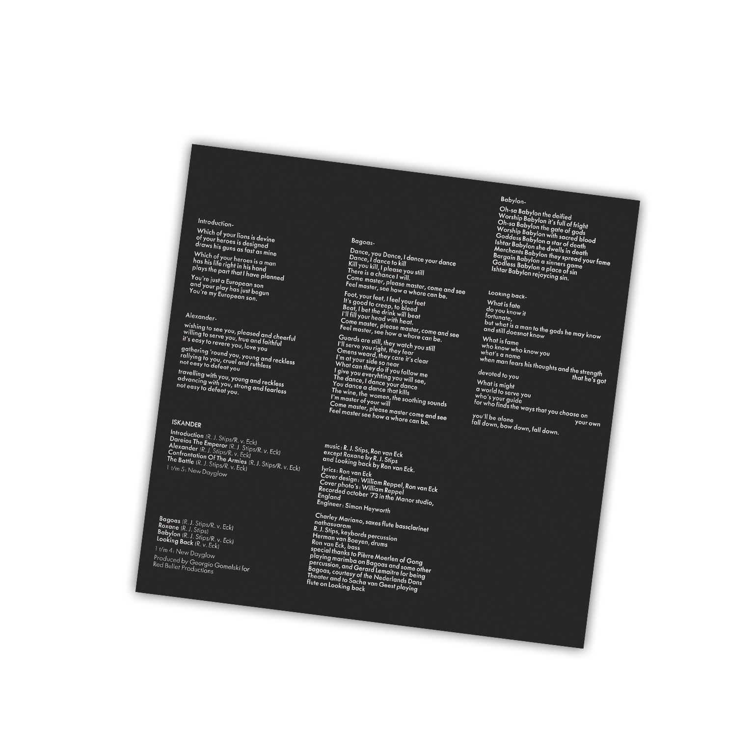 On their fourth album Iskander, from the original Supersister line-up only Robert-Jan Stips and bassit Ron Van Eck remain. The album represents a change in style which is now  jazz-rock and it is a loose concept album about Alexander The Great.