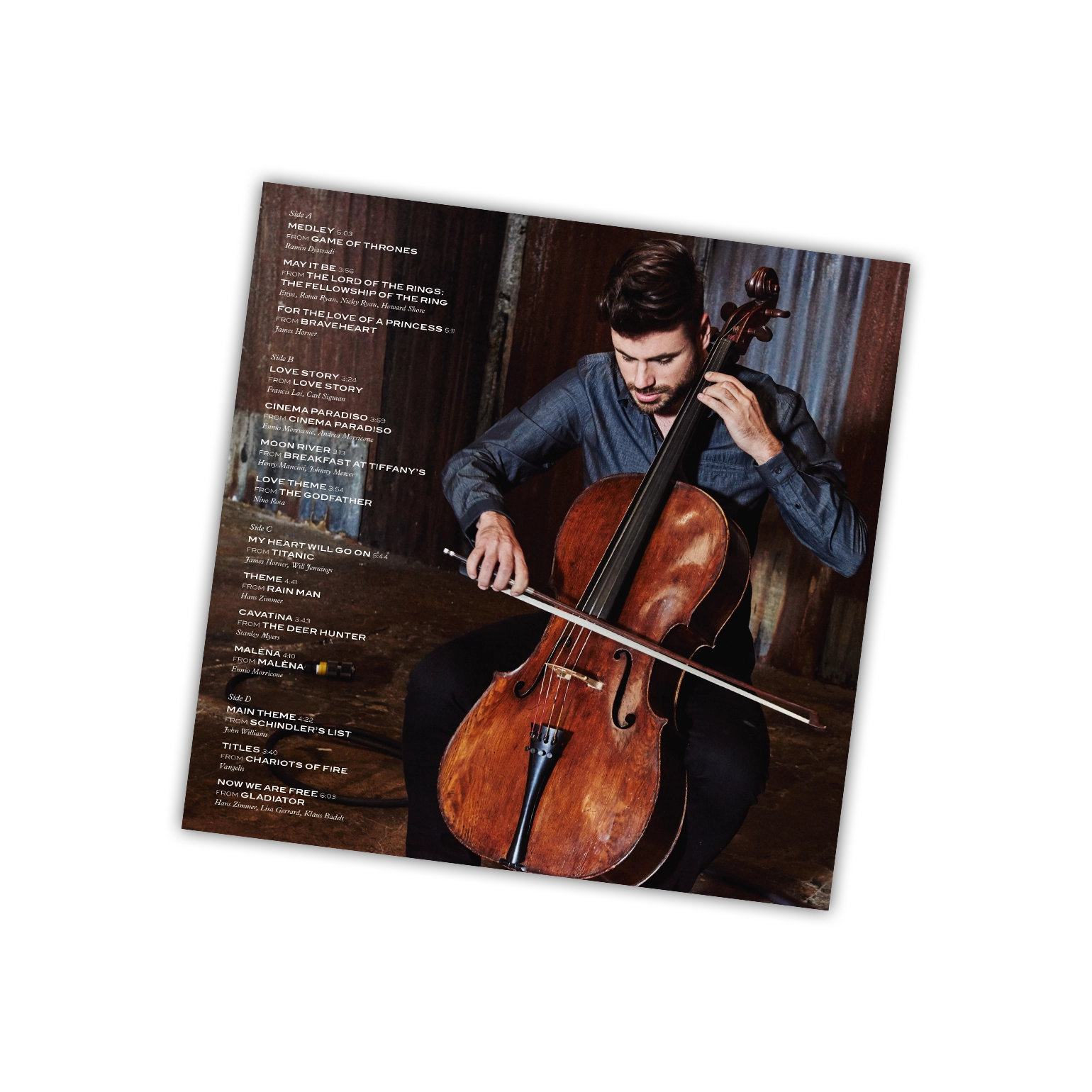 The vocal beauty of the cello's sound is a perfect match for a brace of romantic themes. These include the Henry Mancini and Johnny Mercer song "Moon River" from Breakfast at Tiffany's; Ennio Morricone's beautiful theme for Cinema Paradiso, Nino Rota's love theme for The Godfather; Francis Lai's Oscar-winning theme from Love Story; Hans Zimmer's theme from Rain Man; and Stanley Myers' haunting "Cavatina" heard in The Deer Hunter.