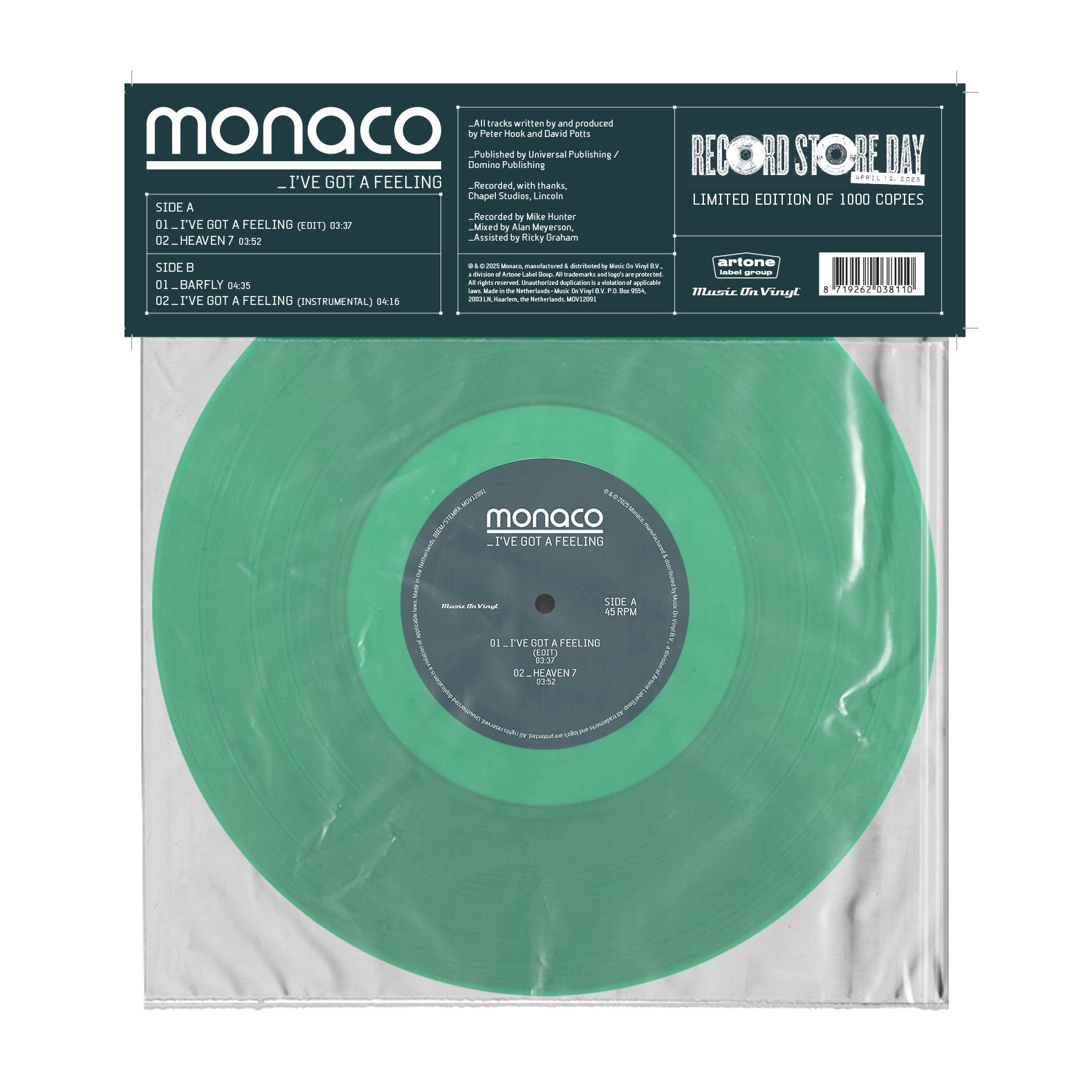 "I've Got A Feeling" is the single that was taken from Monaco's selftitlled second studio album. Now for the first time this single will be available on (12") vinyl, together with 3 other tracks taken from the original CD-single. Monaco was a side project (1995-2000) of New Order bassplayer Peter Hook, together with David Potts, the only remaining member of Revenge. Hook’s distinctive pulsating bass lines united New Order’s marriage of post-punk and pop, creating an identity so recognizable that these Monaco tracks can easily be mistaken for tracks by New Order.